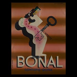 Bonal is a 1920s advertising poster by A. M. Cassandre that uses bold typography and simple, layered shapes to promote the Bonal aperitif, creating a strong, eye-catching design with a sense of depth and elegance.