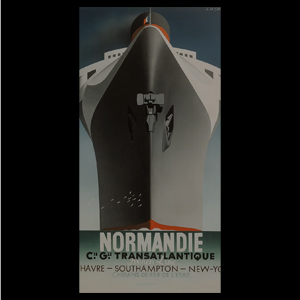 Le Normandie is a famous 1935 poster by A. M. Cassandre showing a huge ocean liner from a dramatic front view, using symmetry and bold shapes to highlight its size, strength, and modern elegance.