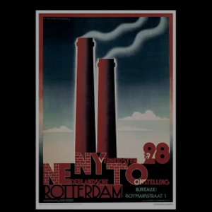 Nederlandsche Nyverheidstentoonstelling is a 1920s poster by A. M. Cassandre that uses bold geometric shapes and strong symmetry to promote a Dutch industrial exhibition, emphasizing progress, industry, and modern design.