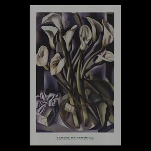 This still life focuses on the sensual curves of calla lilies, using soft gradients and sleek shapes to create a sense of purity and subtle eroticism. The composition highlights Lempicka’s ability to turn simple forms into striking, modern visuals.