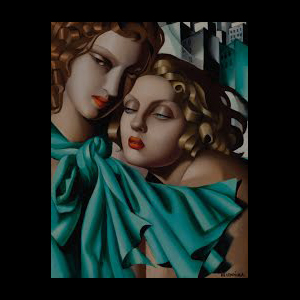 This painting explores intimacy and connection between two figures through intertwined forms and soft yet defined shapes. It conveys both emotional closeness and the stylized elegance of Lempicka’s work.